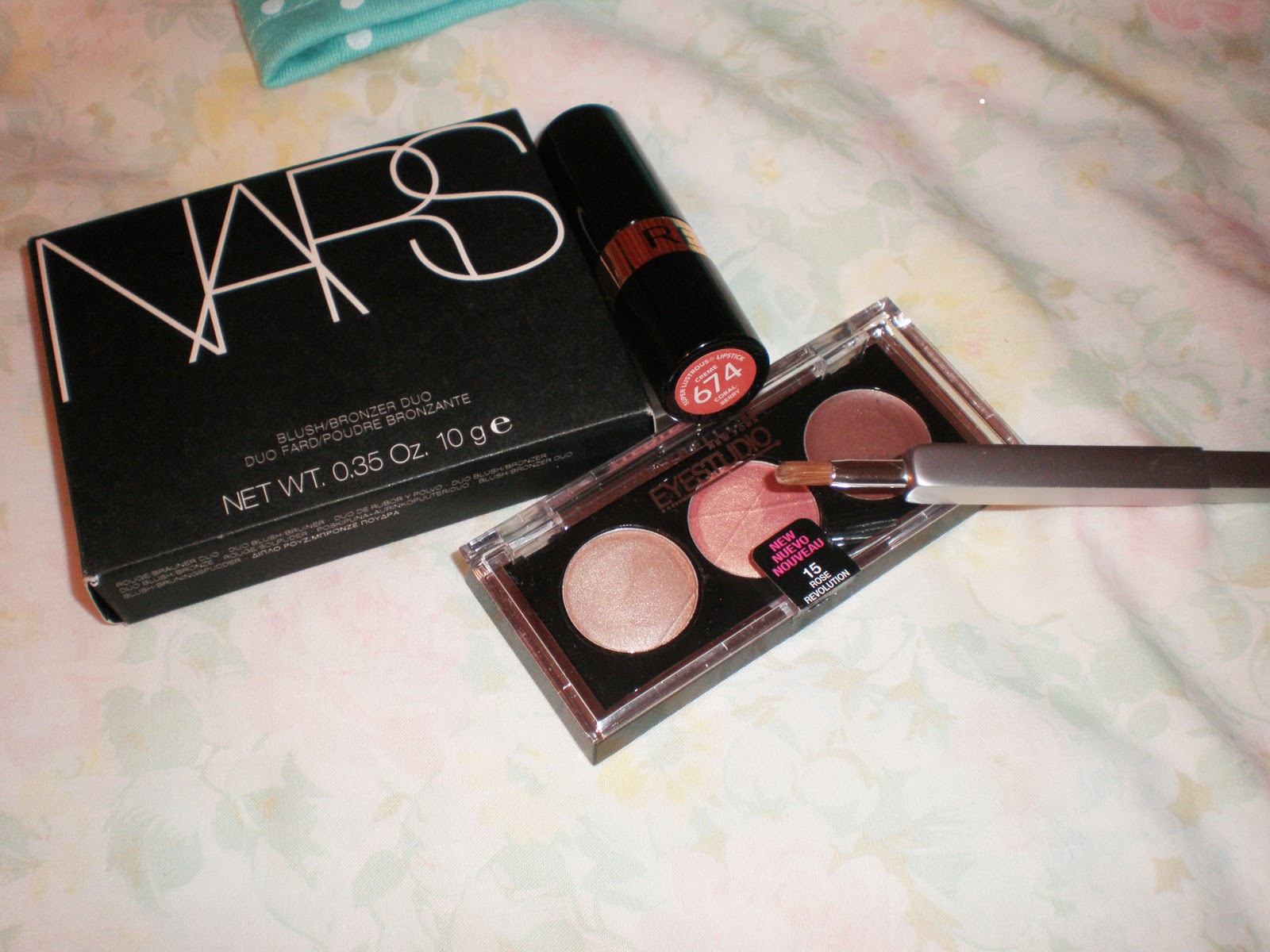 Nars Orgasm blush and Laguna bronzer double :D (I've been waiting to get this in FOREVER!!!) Also Revlon Luxurious Lipstick in Coralberry, Maybelline Eyestudio Cream Eye Shadow Trio in Rose Revolution and I finally got a lip brush! From Sephora. Probably gonna do reviews on the Revlon and Maybelline later.